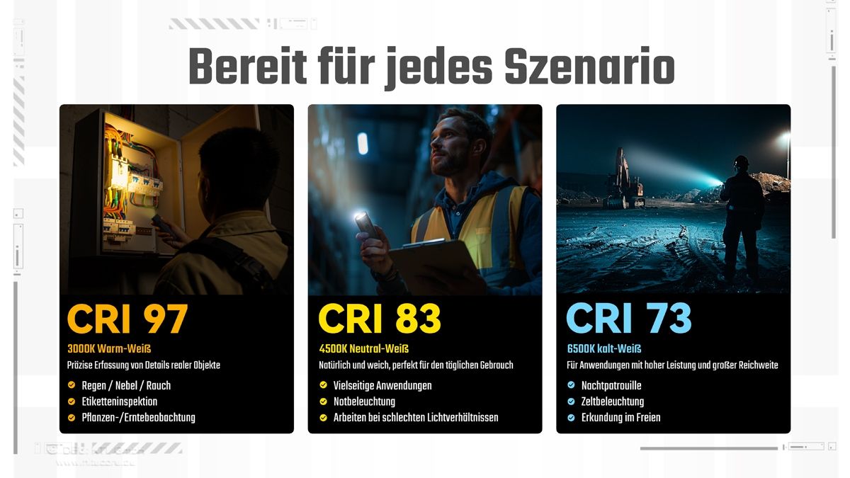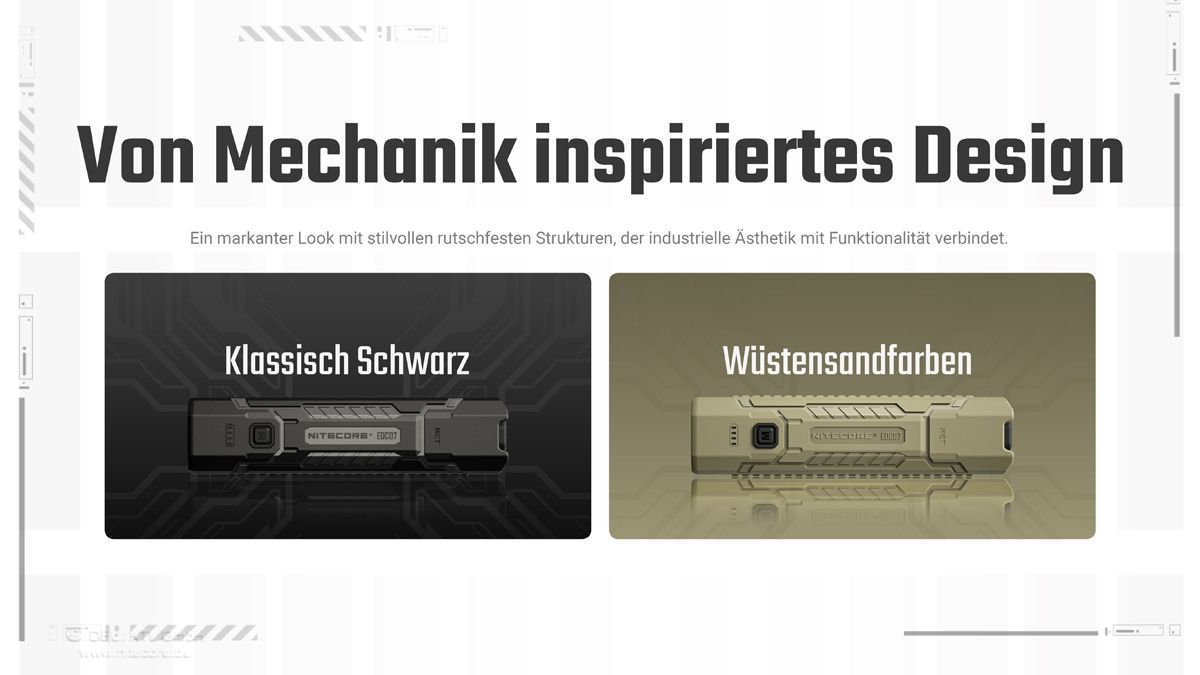 Die Nitecore EDC07 ist das Einsteigermodell der EDC-Taschenlampenserie von Nitecore. Die zwei Quad-Core-MCT-UHE-LEDs (Multi Color Temperature) leisten maximal 1500 Lumen. Die MCT-LED´s können drei Farbtemperaturen darstellen: 6500K Cool White (CRI 73), 4500K Neutral White (CRI 83), 3000K Warm White (CRI 97).