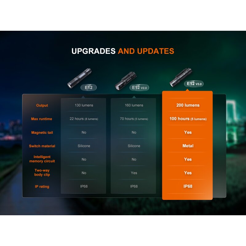 Die Fenix E12 V3.0 ist eine leichte, tragbare EDC-Taschenlampe. Betrieben mit einer AA-Batterie, hat die Taschenlampe eine maximale Leistung von 200 Lumen und einer Reichweite von max. 78 Meter. Die Batterie wird im Standby-Modus nicht verbraucht, so dass für jeden Einsatz ausreichend Energie zur Verfügung steht. Der beidseitige Körperclip und die magnetische Endkappe ermöglichen eine bequeme und freihändige Nutzung.