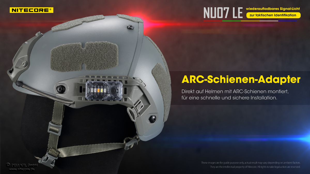 Die Nitecore NU07LE ist eine kleine, kompakte Signallampe. Ihr eingebauter Li-Ion-Akku ist per USB-C aufladbar. Die mitgelieferte Halterung mit Klett auf ihrer Rückseite ermöglicht eine schnelle und einfache Befestigung an Kleidung, Ausrüstung oder Helmen. Zusätzlich ist sie kompatibel zu ARC-Schienen und MOLLE-Systemen. Die Nitecore NU07LE verfügt über 5 Hochleistungs-LEDs mit insgesamt 11 Leucht-Modi, die mit nur einem Taster gesteuert werden. Sie ist besonders leicht, robust und bruchfest.